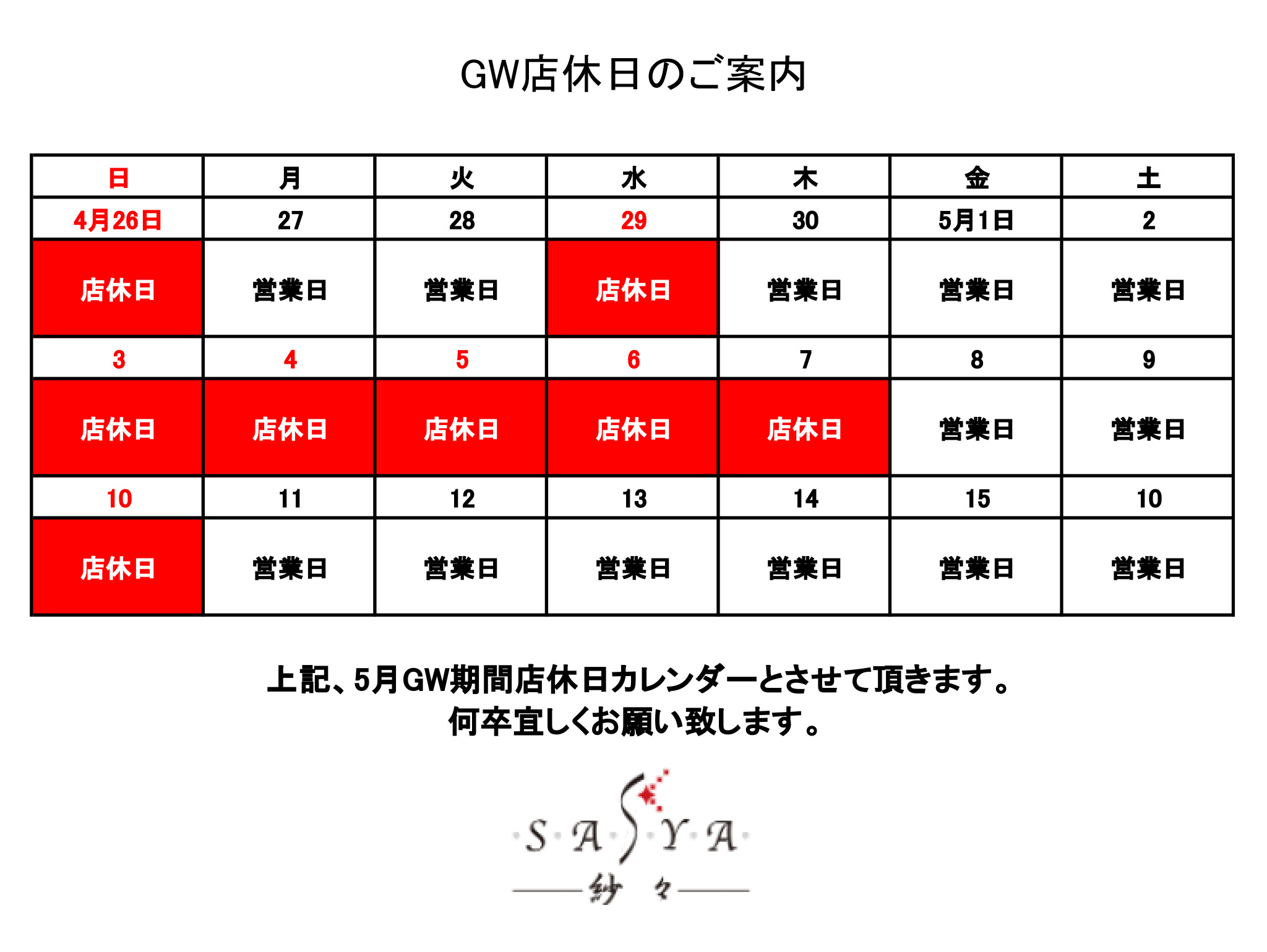 ゴールデンウィークの営業について 2026.04.20 いつもご愛顧ありがとうございます。 紗々のゴールデンウィークの営業は、以下の通りとなっております。 « 4/18(土)出勤情報 4/20(月)出勤情報 »